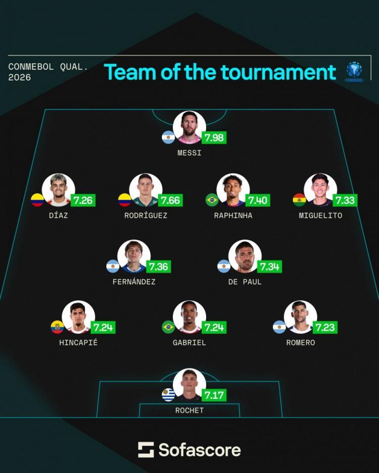 直播吧9月10日讯 南美世预赛最后一轮比赛战罢,Sofascore根据球员本届南美世预赛的场均评分列出最佳阵容,梅西领衔,拉菲尼亚、J罗、迪亚斯、恩佐在列。